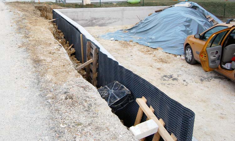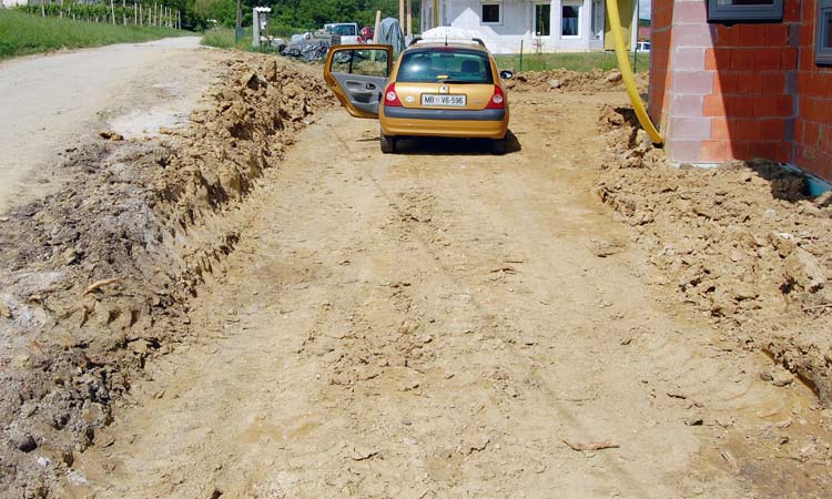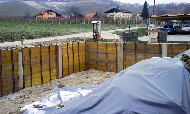 Betonska škarpa meri v dolžino 20 m, 1 m visoka plus temeljenje in 20 cm široka. Škarpo so "zafršolali, enkrat armirali in poklicali hruško. Po končanem gradbenem delu je moški del familije beton premazal z Ibitolom in obložil s hidroizolacijo in dodatno zaščitil še s čepi. Prvi sončni dan smo izkoristili priložnost in škarpo zasipali.